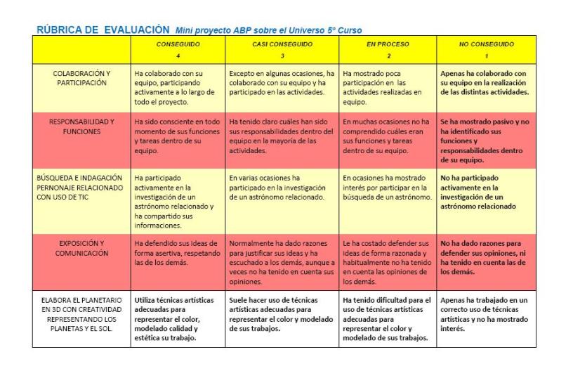 Desde nuestro blog, hoy queremos compar esta rubrica para evaluar un ABP del Universo y poder utilizar como plantilla para adaptar a cualquier curso o asignatura.
